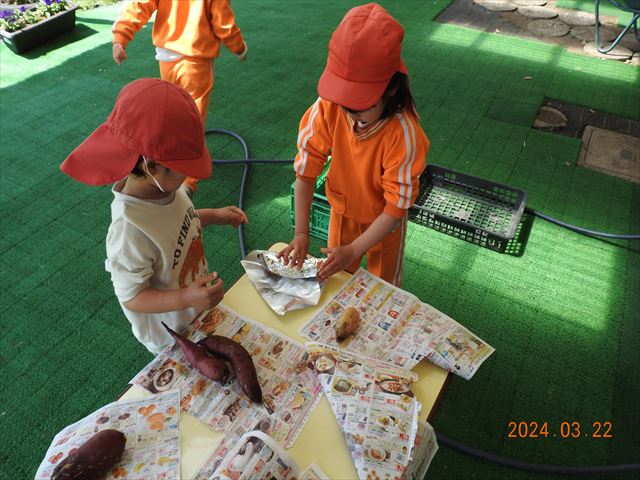 園で収穫したお芋で焼き芋づくり。お芋を洗ってホイルで巻き巻き!